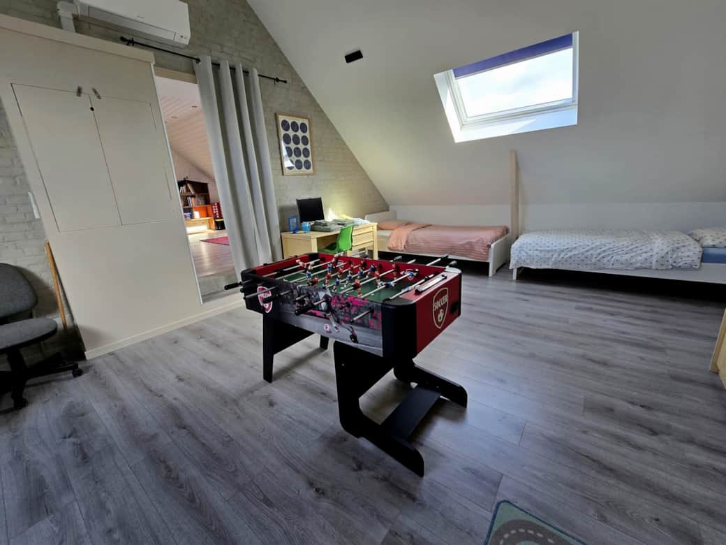 Op de tweede verdieping bevindt zich een ruime zolderkamer, ingericht met vier éénpersoonsbedden en twee extra uitschuifbare bedden. De kamer beschikt over airco, voldoende opbergruimte en een aparte speelhoek, waardoor kinderen en jongeren zich helemaal kunnen uitleven. Een ideale plek voor samen spelen, lezen of rustig ontspannen na een dag vol avontuur.